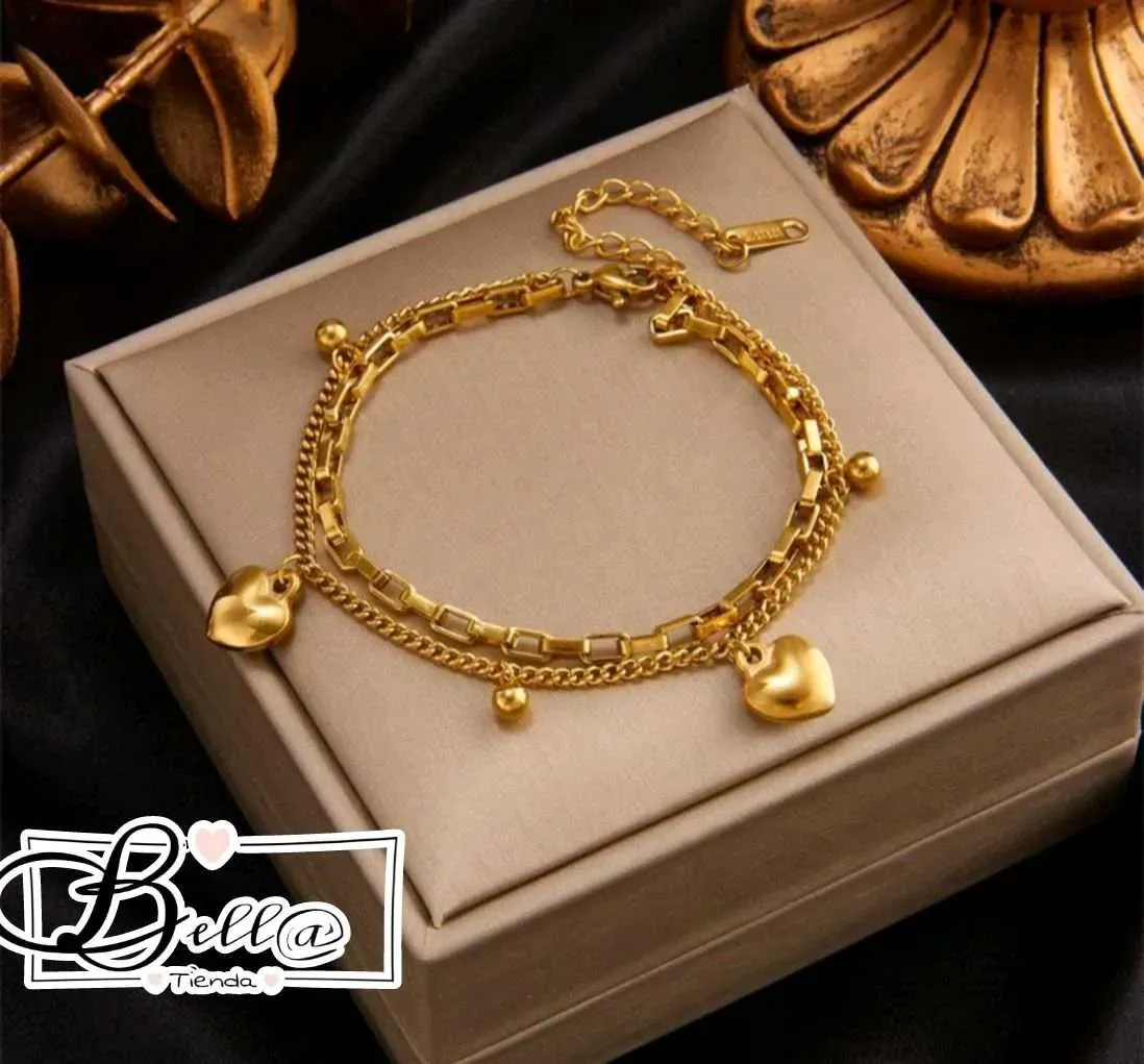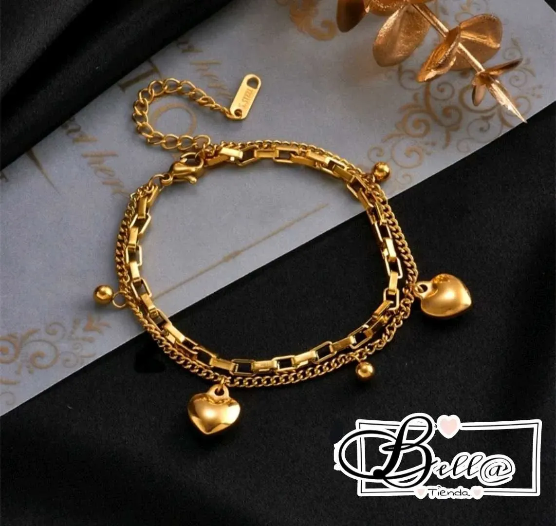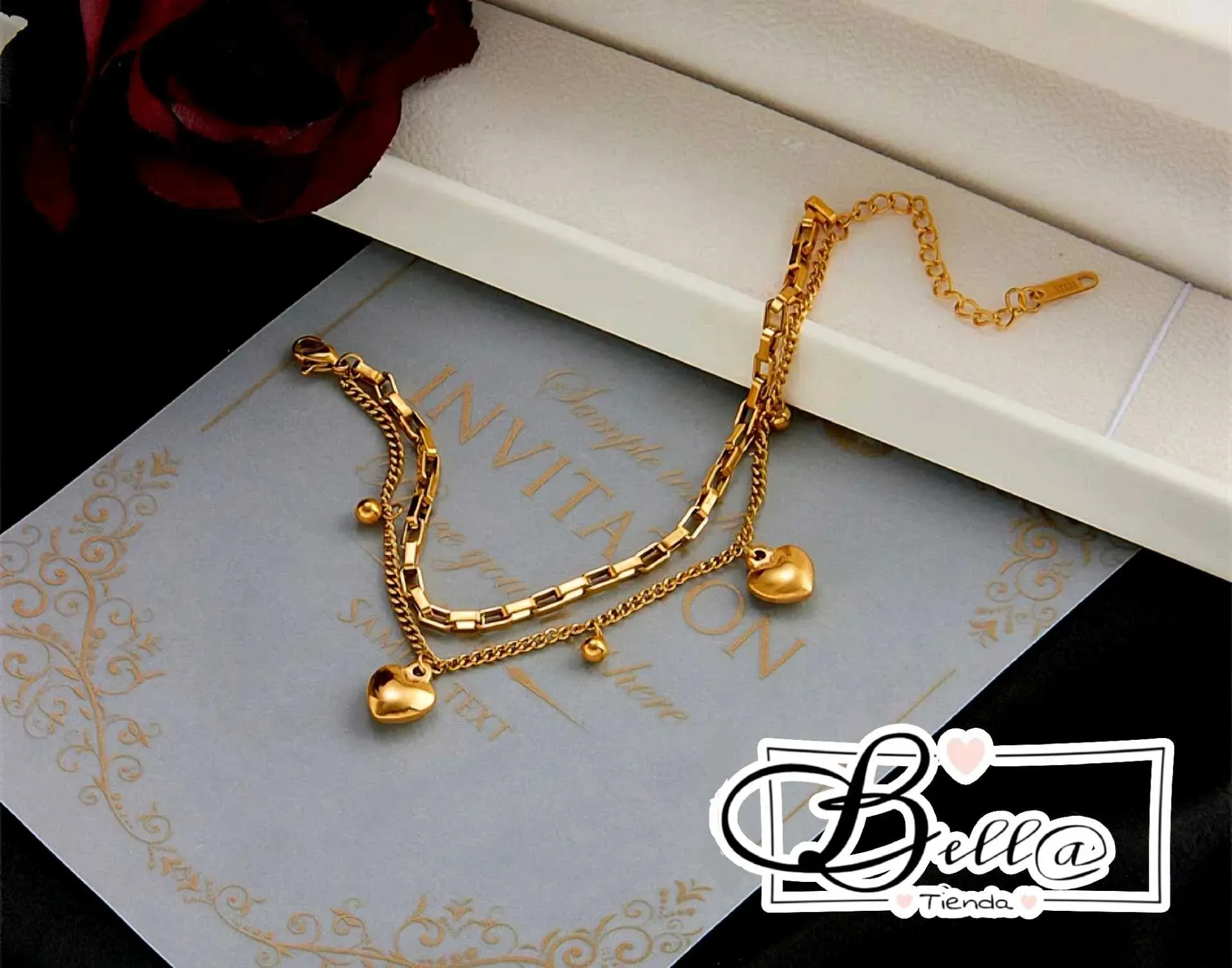 Pulsera Doble dijes Corazones y Balines 💛✨️