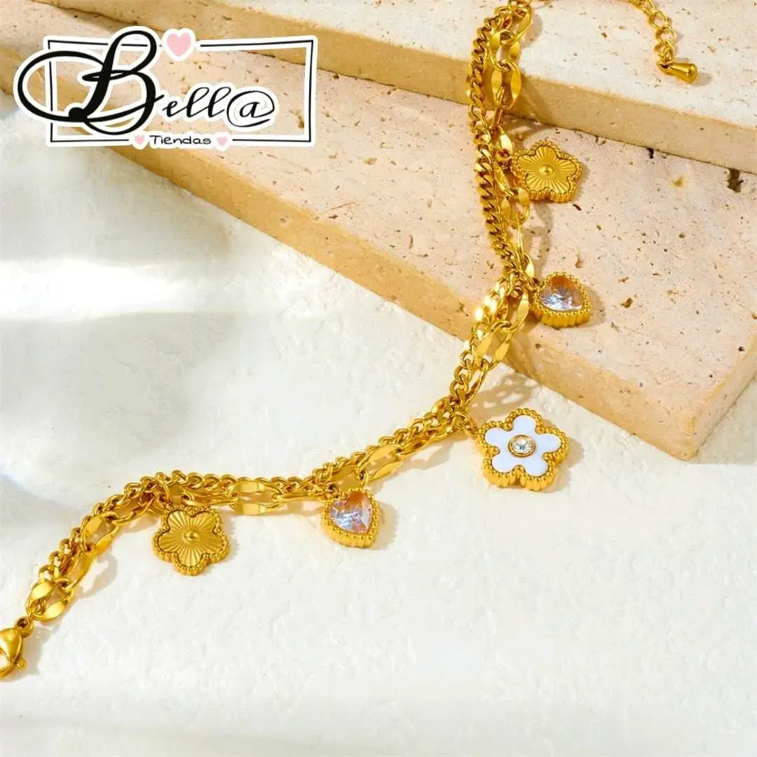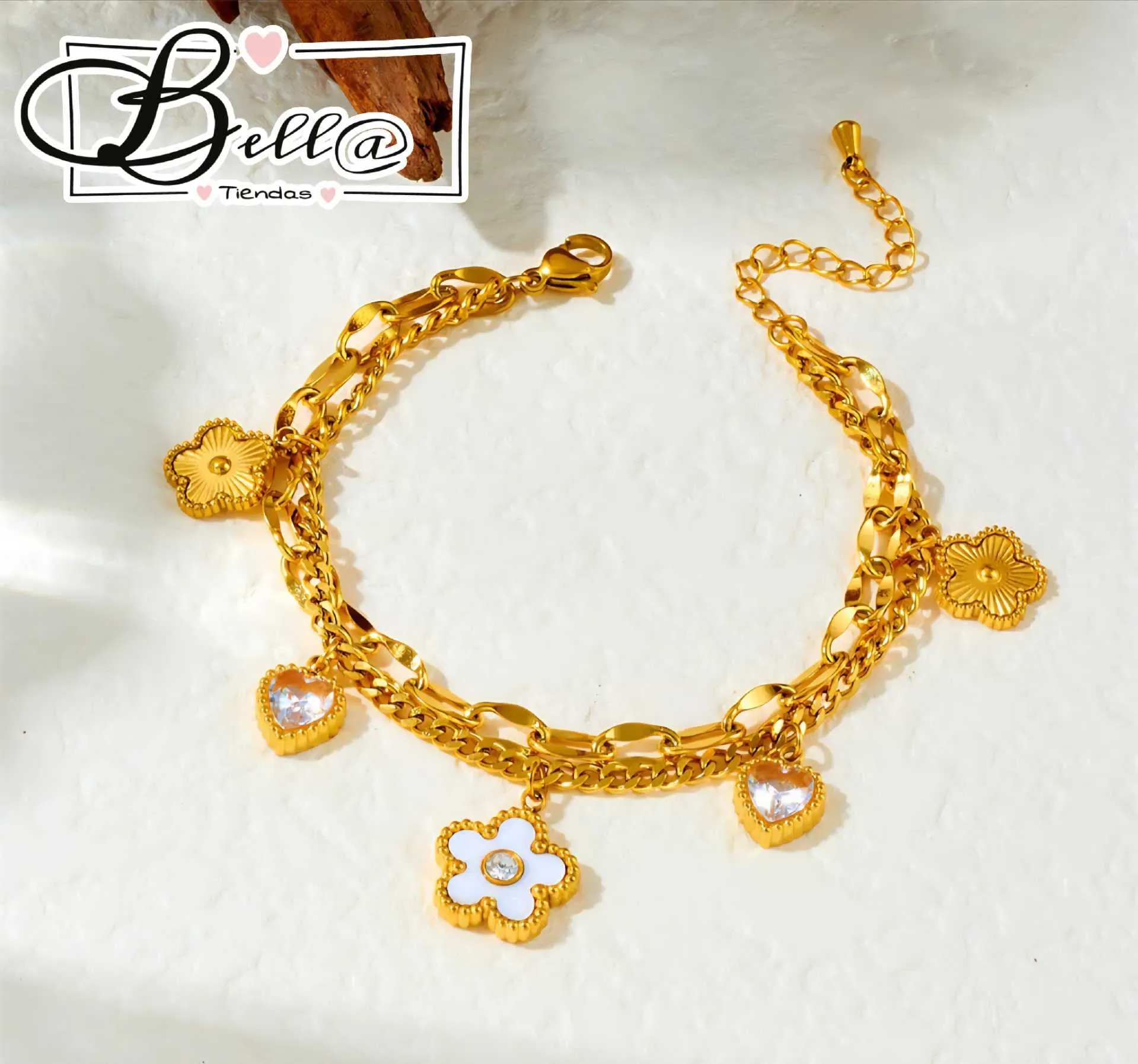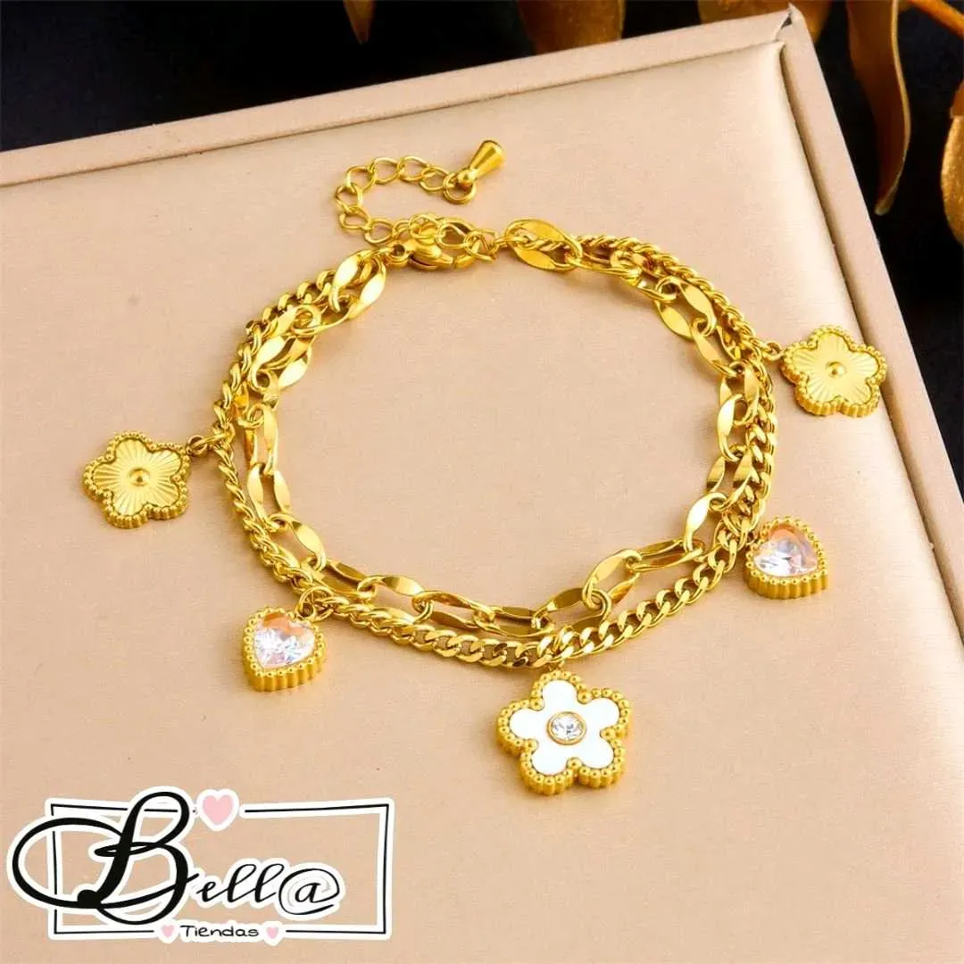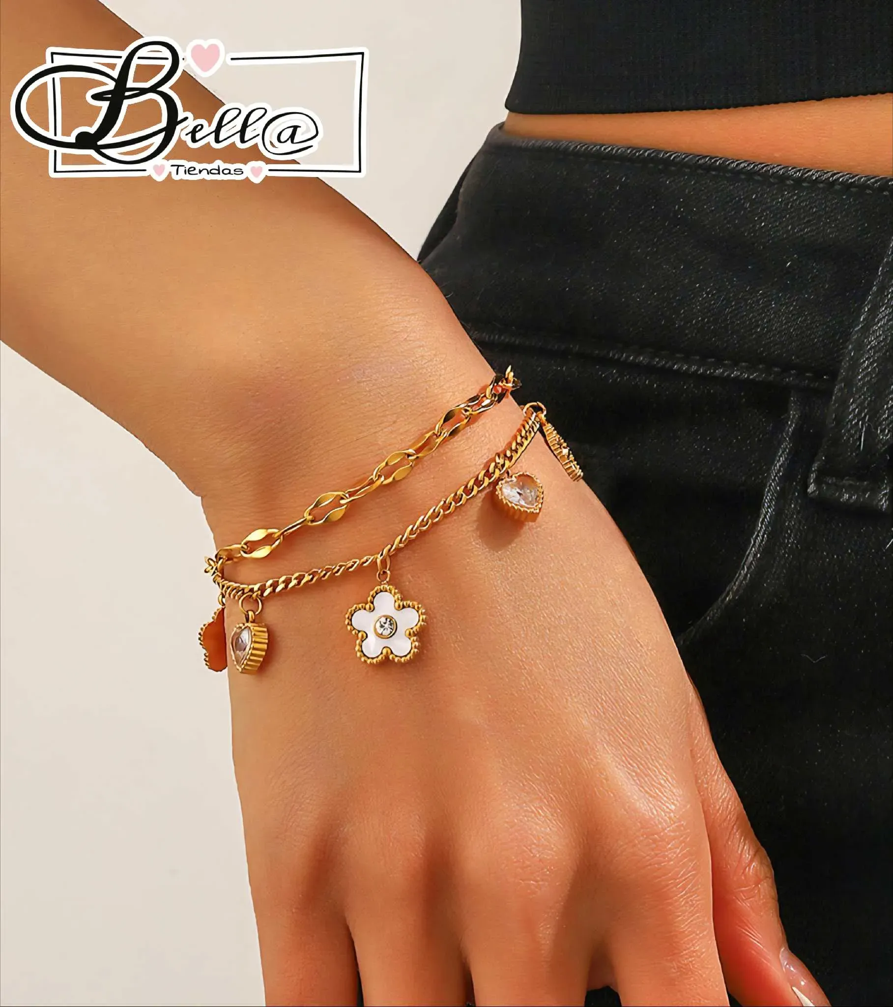 Pulsera Doble dijes Flores y Corazones 💎✨️